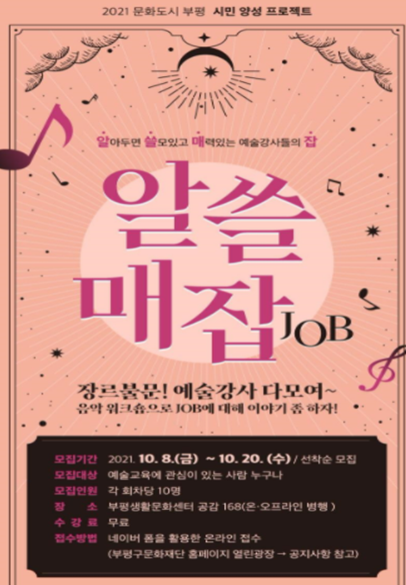 (포탈뉴스) 부평구문화도시센터가 오는 20일까지 문화도시 부평 조성사업일환으로 진행하는 ‘알쓸매잡(JOB)(알아두면 쓸모 있고 매력 있는 예술강사들의 잡(JOB))’ 참여자를 선착순으로 모집한다.