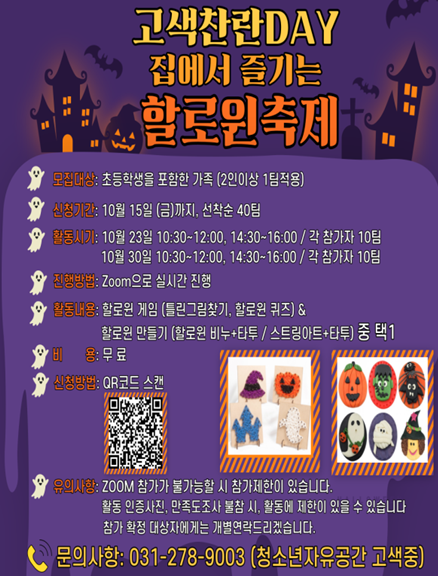 (포탈뉴스) 수원시청소년재단 청소년자유공간[고색중]은 10월 23일부터 10월 30일까지 총 4회에 걸쳐 비대면으로 할로윈축제를 진행한다고 밝혔다.