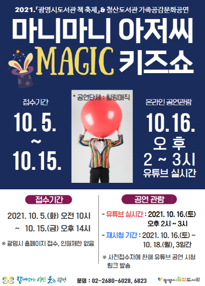 어린이 마술쇼 공연은 10월 16일 토요일 오후 2시부터 3시까지 유튜브 실시간으로 진행되며, 기형도 공연은 오후 4시부터 5시까지 사전 녹화 영상으로 시청할 수 있다.