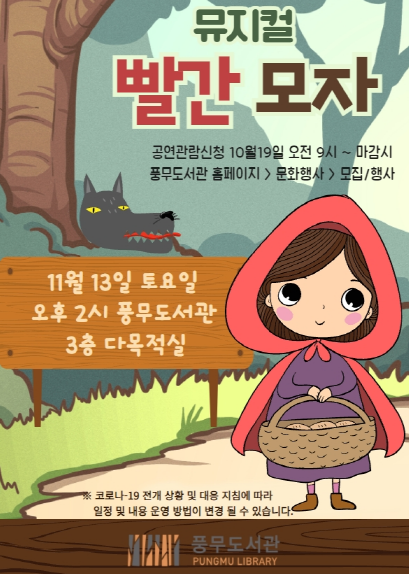 (포탈뉴스) 김포시 풍무도서관은 11월 13일 토요일 14시 문화공연 프로그램 뮤지컬「빨간모자」를 운영한다.