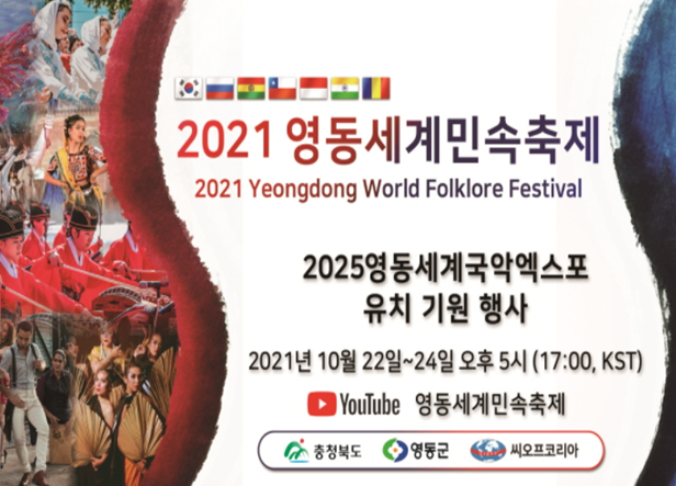 충북 영동군은 2025영동세계국악엑스포의 사전홍보와 국제행사 유치를 위한 세계화 방안의 일환으로 ‘2021영동국제민속축제’를 오는 10월 22일부터 24일까지 3일간 유트브채널을 활용해 온라인으로 개최키로 했다.