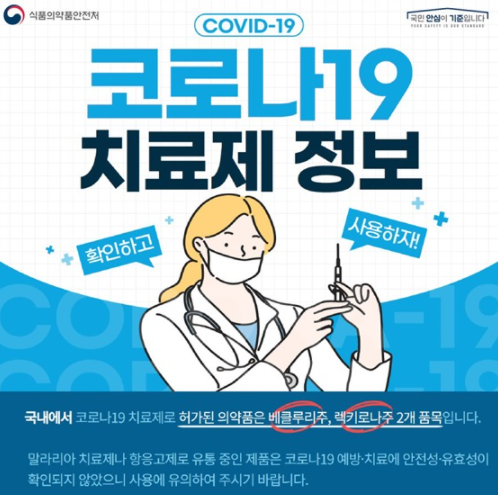 말라리아 치료제나 항응고제로 유통 중인 제품은 코로나19 예방·치료에 안전성·유효성이 확인되지 않았으니 사용에 유의하여 주시기 바랍니다.