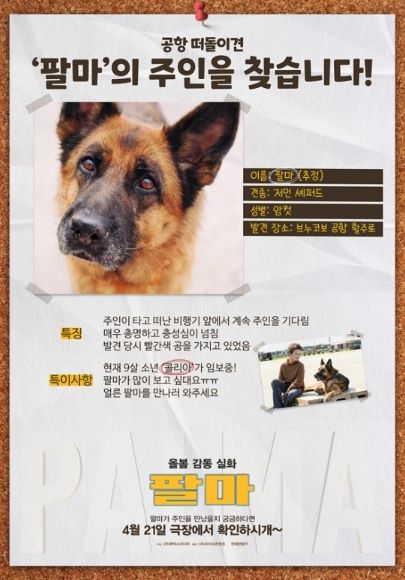 이번에 공개된 '팔마' ‘주인을 찾습니다’ 포스터는 영화 속 주인공이자 공항 떠돌이견 ‘팔마’의 주인을 찾는 전단 컨셉으로 구성되어 눈길을 사로잡는다.