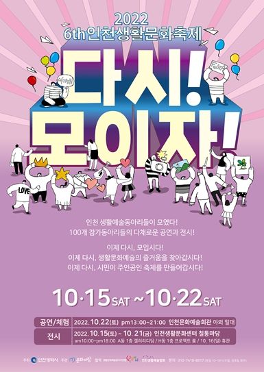(포탈뉴스) 인천광역시는 2022 인천생활문화축제, ‘다시, 모이자!’가 10월22일 인천문화예술회관 야외광장에서 개최된다고 밝혔다.