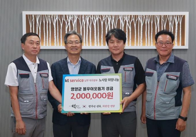 (포탈뉴스통신) (주)케이티 서비스 남부 대구본부 안동지사 김현승 안동지사장과 이종표 대구본부 노조지부장은 26일 영양군청을 방문해 지역의 어려운 이웃과 희망을 나누고자 성금 200만원을 전달했다.