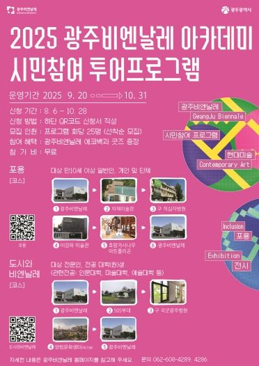 일반 시민뿐 아니라 대학생·대학원생을 대상으로 맞춤형 교육 콘텐츠를 제공해 현대미술에 대한 이해도를 높이고, 지역 문화예술기관과의 협력을 강화할 예정이다. 참가 비용은 무료이며, 광주비엔날레 홈페이지나 전화로 신청하면 된다.