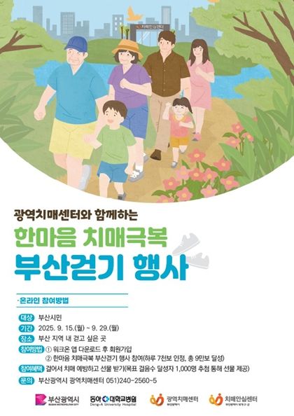 또한, 오늘(15일)부터 29일까지 주간행사로 워크온 앱을 활용한 비대면 '한마음 치매극복 부산걷기 행사'와 온라인 이벤트 등 다양한 참여 프로그램이 진행된다. 이를 통해 시민들에게 치매 관리의 중요성을 널리 알리고 치매 극복을 위한 사회적 공감대를 형성할 계획이다.
