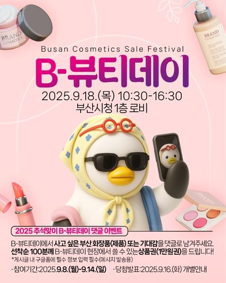 (포탈뉴스통신) 부산시는 오는 9월 18일 오전 10시 30분부터 오후 4시 30분까지 시청 1층 로비에서 '2025 추석맞이 비(B)-뷰티 데이'를 개최한다고 밝혔다.