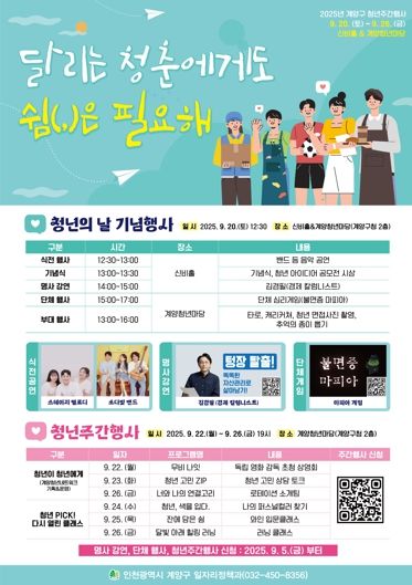 (포탈뉴스통신) 인천광역시 계양구는 청년의 날(9월 셋째 주 토요일)을 맞아, 오는 9월 20일부터 26일까지 청년주간행사를 운영한다고 밝혔다.