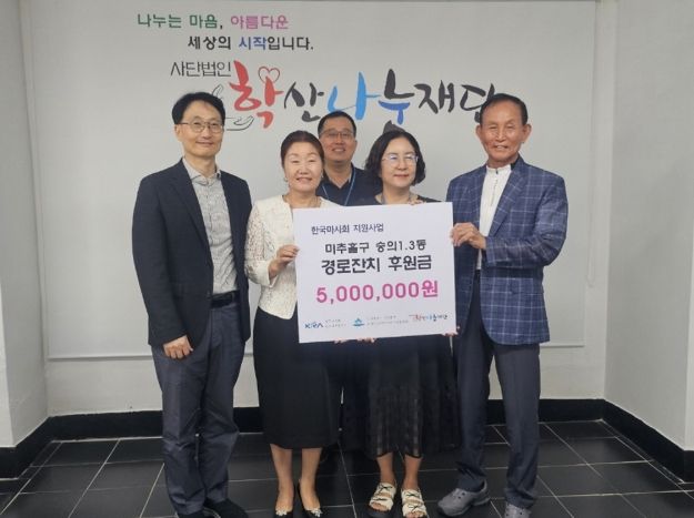 (포탈뉴스통신) 미추홀구 숭의1·3동 지역사회보장협의체(위원장 민명숙)는 한국마사회 인천미추홀지사(지사장 조영진)의 공모사업에 ‘숭의1·3동 경로잔치’가 선정돼 지난 18일 기부금 500만 원을 전달받았다.
