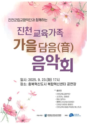 (포탈뉴스통신) 충청북도진천교육지원청은 오는 9월 23일 17시,충북혁신도시 복합혁신센터에서 '2025. 진천교육가족 가을담음(音) 음악회'를 개최한다.