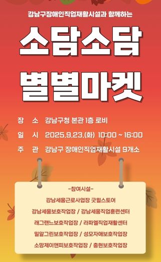 (포탈뉴스통신) 꿈이 모이는 도시, 미래를 그리는 강남구가 9월 23일 오전 10시부터 오후 4시까지 구청 본관 1층에서 장애인생산품 특별판매·홍보전 ‘소담소담 별별마켓’을 개최한다.