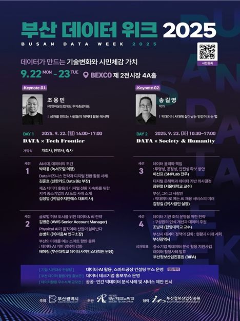 또한, 2일 차에는 부산시 빅데이터혁신센터 사업 참여기업인 ▲허슬러즈 ▲링스업 등이 직접 우수사례를 발표하며, '2025년 중소기업 빅데이터 분석·활용 지원 사업' 등 2025년 시가 추진한 데이터 생태계 조성 성과도 공유한다.