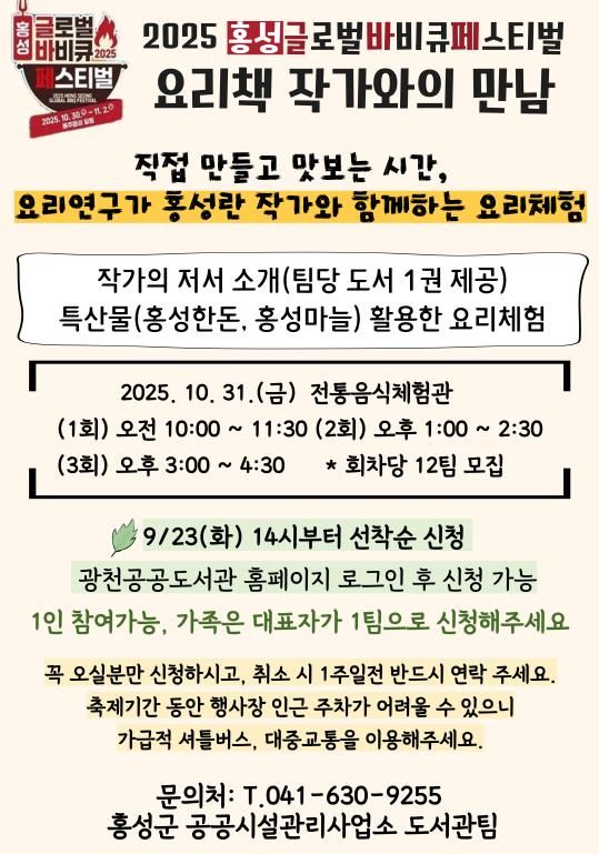 이번 행사는 2025 홍성글로벌바비큐페스티벌과 연계해 지역 특산물을 활용한 요리 체험과 작가와의 소통을 통해 독서문화 확산과 농·특산물 홍보를 함께 추진한다.
