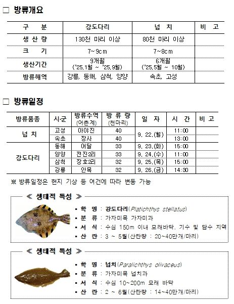 강도다리와 넙치는 단백질 함량이 높고 육질이 단단해 횟감으로 수요가 많은 동해안 대표 어종으로, 종자 방류 시 경제적 효과가 약 2.5배에 달해 자원 조성 효과가 높은 것으로 평가된다.