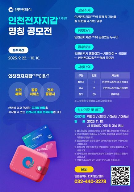 (포탈뉴스통신) 인천광역시는 시민들에게 더욱 편리한 디지털 생활을 제공하기 위해 도입하는 블록체인 기반 비대면 공공서비스 앱 ‘인천전자지갑(가칭)’의 명칭 공모전을 9월 22일부터 10월 10일까지 19일간 진행한다고 밝혔다.