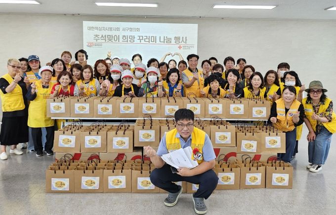 매년 서구협의회 적십자봉사원들이 십시일반 모은 기부금으로 마련된 ‘추석맞이 희망꾸러미 나눔활동’은 명절을 앞두고 쓸쓸해지는 이웃들에게 따뜻한 정을 나누고자 진행됐으며, 샴푸나 비누 등 생활필수품과 직접 만든 빵, 삼계탕 밀키트 등으로 구성된 희망꾸러미 120여개를 정성껏 포장 후 직접 전달하며 따뜻한 온기를 전달한다.