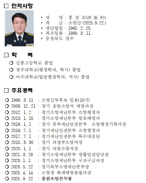 홍 본부장은 1999년 소방간부후보생(10기)으로 임용된 뒤 경기 의정부소방서장, 경기소방재난본부 구조구급과장, 경기북부소방재난본부장, 소방청 화재예방총괄과장 등을 두루 거쳤다.