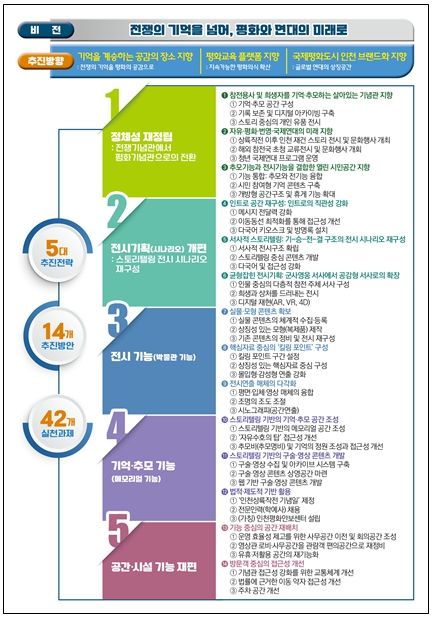 비전은 “전쟁의 기억을 넘어, 평화와 연대의 미래로” 이며, 이를 실현하기 위한 3대 추진방향으로 ▲기억을 계승하는 공공의 장소 지향 ▲평화교육 플랫폼 지향 ▲국제평화도시 인천 브랜드화 지향을 제시했다. 또 이를 구체화하기 위해 5대 추진전략, 14개 추진방안, 42개 실천과제가 마련됐다.