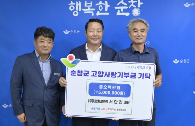 (포탈뉴스통신) 순창 출신 기업인 (주)대한패브릭 서한집 대표이사가 23일 순창군에 고향사랑기부금 500만원을 전달하며 올해로 3년째 고향사랑을 실천했다.