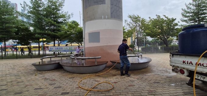 구는 이물질로 얼룩진 벤치를 고압 세척하고 이후 오일스테인 작업을 통해 벤치의 위생 상태 및 미관 개선을 개선했다.
