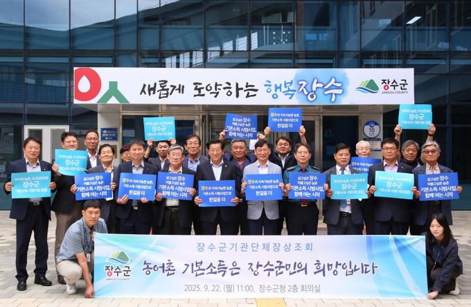 군은 22일 군청 회의실에서 최훈식 장수군수를 비롯해 최한주 군의회의장, 황재현 장수경찰서장, 추영곤 장수교육지원청교육장 등 주요 기관·단체장 20여 명이 참여한 ‘2025년 제2차 기관·단체장 상조회’를 통해 농어촌 기본소득 시범사업 선정을 위한 협력을 다졌다.