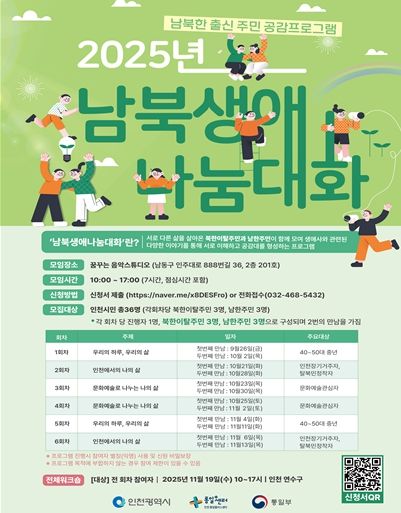 (포탈뉴스통신) 인천광역시는 북한이탈주민과 인천 주민이 서로의 삶을 이야기하며 공감대를 형성하는 시민참여형 프로그램인 ‘남북생애나눔대화’ 를 9월 26일부터 11월 19일까지 진행한다고 밝혔다.