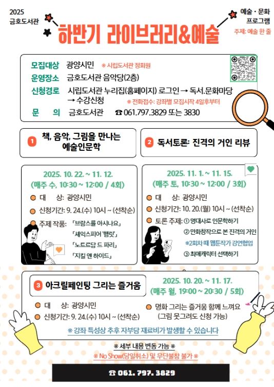 (포탈뉴스통신) 광양시 금호도서관은 오는 10월부터 11월까지 하반기 프로그램 '라이브러리·예술'을 운영한다고 밝혔다.