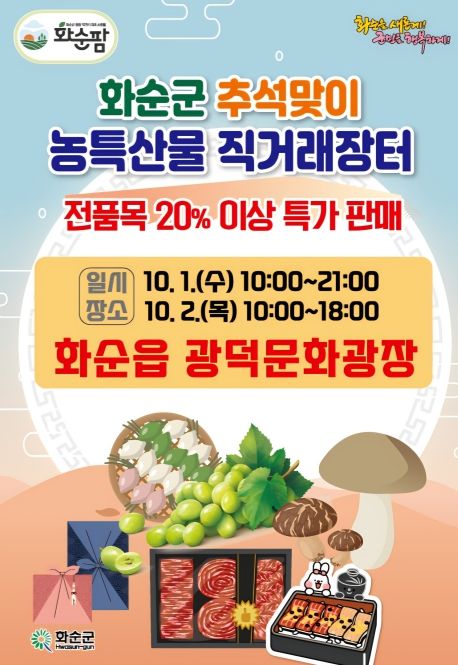 (포탈뉴스통신) 화순군은 추석을 맞아 10월 1일과 2일 이틀간 광덕문화광장에서 ‘추석맞이 농·특산물 직거래장터’를 개최한다고 밝혔다.