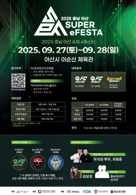 또한, 아산시 출신이자 올해 5월 아산시 홍보대사로 위촉된 가수 ‘김보경’의 축하 공연을 시작으로 FC 온라인 인기 인플루언서인 ‘두치와뿌꾸(안태은)’과 ‘유봉훈(유정훈)’, 충남아산FC 선수단들이 대회 현장을 찾아 이벤트 매치, 팬사인회, FC온라인 유저 스쿼드 평가 등 다양한 프로그램으로 현장 관람객들과 소통할 예정이다.