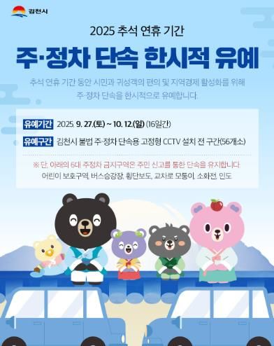 (포탈뉴스통신) 김천시는 9월 27일부터 10월 12일까지 16일간 추석 명절 기간 주정차 단속 카메라가 있는 전 구간(56개소)에 대하여, 단속 카메라를 통한 불법 주정차 단속을 유예한다.