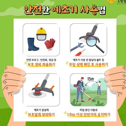 예초기 사고 예방법으로는 ▲사용전 올바른 예초기 사용법 숙지, ▲작업 전 신체를 보호할 수 있는 안면 보호구, 보호안경, 무릎 보호대, 안전화, 장갑 등 보호장비 착용, 칼날 보호덮개 장착, ▲작업 중에는 작업 반경 내 접근금지, ▲특히, 작업 중 예초기 칼날에 이물질이 끼었을 때는 반드시 예초기 동력을 차단하고 장갑을 낀 후 이물질을 제거 등이 있다.