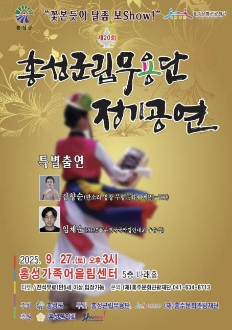 (포탈뉴스통신) 홍주문화관광재단은 오는 27일 오후 3시 홍성가족어울림센터에서 홍성군립무용단 제20회 정기공연 ‘꽃 본 듯이 날 좀 보show’를 개최한다고 밝혔다.