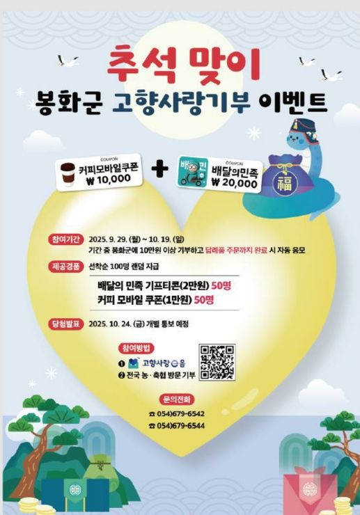 또한 이벤트 기간 중 오는 10월 16일부터 19일까지 열리는 ‘봉화송이축제’ 행사장 내 고향사랑 홍보 부스를 방문해 현장 기부에 참여하면 봉화사랑상품권 2만원을 추가로 지급한다.