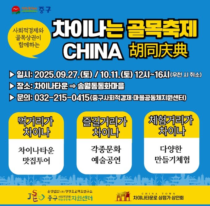(포탈뉴스통신) 인천 중구 사회적경제·마을공동체 지원센터는 올해 9월부터 11월까지 인천 차이나타운·동화마을 일원에서 ‘2025년도 사회적경제와 골목상권이 함께하는 '차이나는 골목축제'’를 개최한다고 25일 밝혔다.