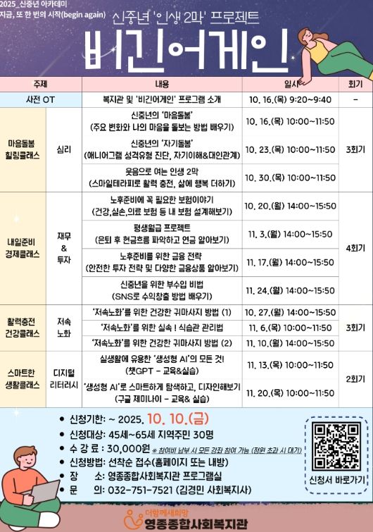 (포탈뉴스통신) 인천 중구 영종종합사회복지관은 오는 10월 16일부터 11월 24일까지 45세~65세 지역 주민을 대상으로 신중년 아카데미 ‘비긴어게인’을 운영한다고 밝혔다.