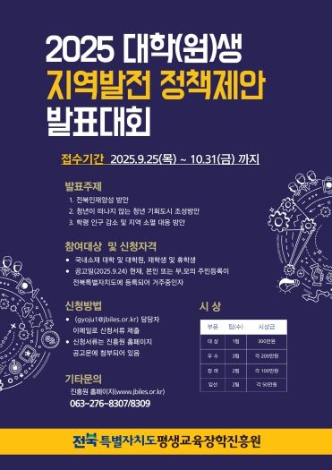 (포탈뉴스통신) 전북특별자치도평생교육장학진흥원은 지역 발전에 대한 청년들의 관심과 참여를 높이기 위해 '2025년 대학(원)생 지역발전 정책제안 발표대회'를 개최한다고 24일 밝혔다.
