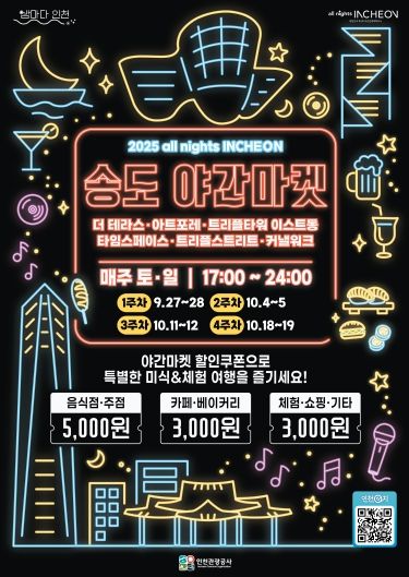 (포탈뉴스통신) 인천광역시와 인천관광공사(사장 백현)는 9월 27일부터 10월 19일까지 매주 토·일 4주간 송도 일대 6개 상권에서 풍성한 할인혜택과 더불어 상권별 다양한 행사를 즐길 수 있는‘2025 all nights INCHEON 송도 야간마켓’을 개최한다고 밝혔다.