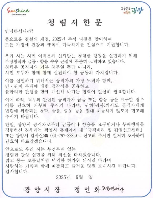(포탈뉴스통신) 광양시가 9월 24일 추석 명절을 앞두고 외부 민원인과 내부 직원들에게 청렴서한문을 발송해 청렴한 공직문화와 건전한 명절 분위기 조성에 앞장섰다.