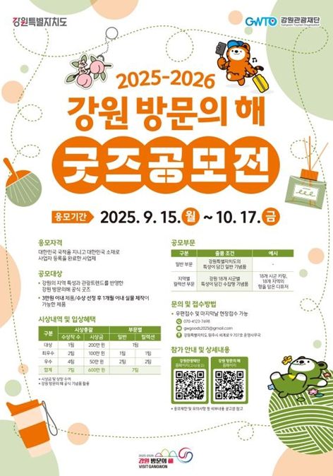 (포탈뉴스통신) 강원특별자치도와 강원관광재단은 ‘2025-2026 강원 방문의 해’를 기념하여 독창적인 관광 기념품을 발굴하기 위한 ‘굿즈 공모전’을 개최한다.