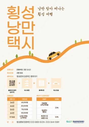 횡성 낭만택시는 사전예약으로 진행되며, 예약 및 요금 안내는 횡성문화관광재단 홈페이지를 통해 확인할 수 있다.