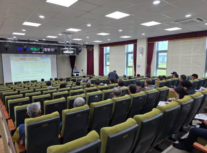(포탈뉴스통신) 군산시농업기술센터는 지난 25일 3개 벼농사 시범사업 단지·쌀 채종포단지·선도농업인·농업인상담소장 등 80여 명이 참석한 가운데 ‘2025년 벼농사 종합 평가회’를 농업인평생학습센터 강당에서 개최했다.
