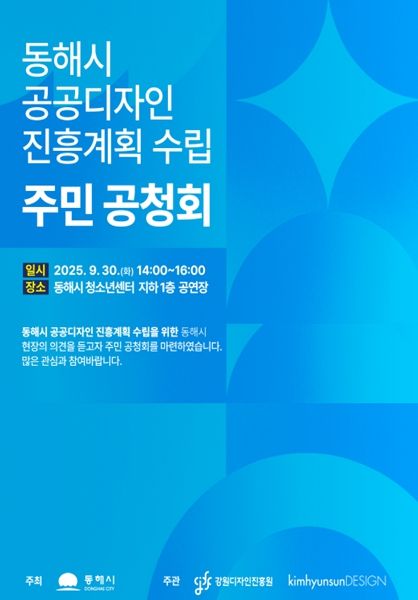 (포탈뉴스통신) 동해시는 시민과 함께하는 열린 정책 수립을 위해 '동해시 공공디자인 진흥계획(안)' 공청회를 오는 9월 30일 오후 2시, 동해시 청소년센터 1층 공연장에서 개최한다고 밝혔다.