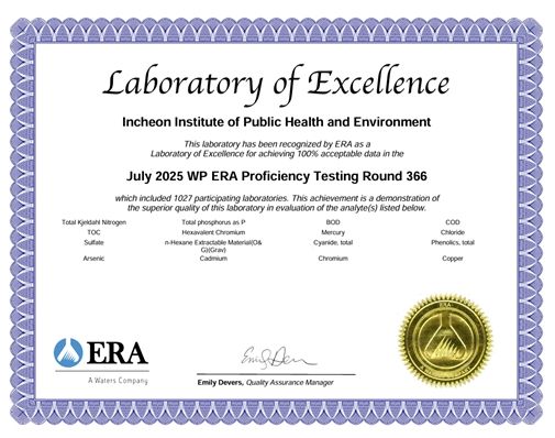(포탈뉴스통신) 인천광역시 보건환경연구원은 미국 환경자원협회(ERA)가 주관한 2025년 환경분야 국제숙련도 평가에서 ‘최우수 등급(Laboratory of Excellence)’을 받았다고 밝혔다.