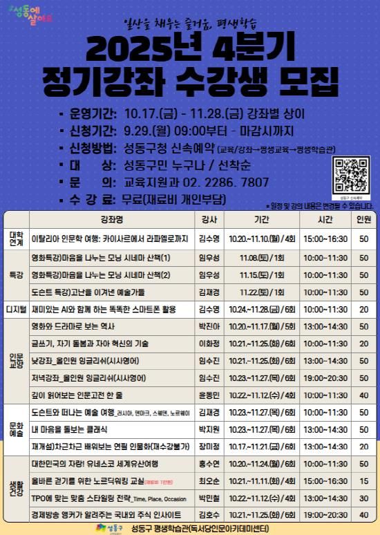 (포탈뉴스통신) 서울 성동구가 2025년 4분기 평생학습관 정기강좌 수강생을 오는 9월 29일(월) 오전 9시부터 성동구청 누리집(홈페이지) 신속예약에서 선착순으로 모집한다.
