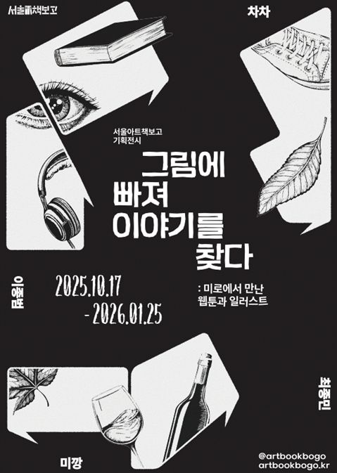 서울아트책보고에서는 10월 17일부터 내년 1월 25일까지 '그림에 빠져 이야기를 찾다 : 미로에서 만난 웹툰과 일러스트' 전시가 열린다. 미로 형태로 구성된 전시장에서 웹툰 ‘닥터 프로스트’의 이종범 작가를 비롯, 미깡, 최종민, 차차의 작품을 감상하며 관람객이 스스로 이야기를 만들어 가는 특별한 경험을 할 수 있다. 심리학적 내면 탐구부터 일상의 서정적 풍경, ‘팝 스트리트 아트’의 강렬한 색감까지 다양한 스타일의 작품으로 눈과 마음이 모두 즐거워진다.