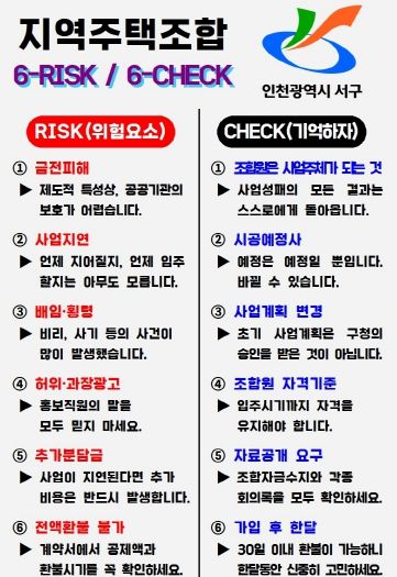 서구는 지역주택조합의 전국적 파산 사례와 사업 정체로 인한 피해가 만연함에 따라 구민의 이해도를 높이고 보다 신중하게 사업에 참여할 수 있도록 지원하고자 조합의 위험 요소와 가입 전 확인해야 할 주요 사항을 담은 ‘지역주택조합 6-RISK / 6-CHECK’를 소식지와 안내문 등을 통해 지속적으로 배포할 계획이다.