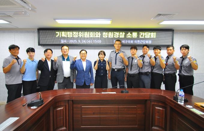 이날 간담회에는 기획행정위원회 소속 김원진 위원장, 한승일 의원, 김춘수 의원, 김학엽 의원과 함께 서구청 총무과장, 김진삼 청원경찰 반장 외 7명의 청원경찰이 참석했다.