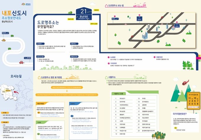 임택빈 도 토지관리과장은 “이번 도로명주소 안내도 배포로 내포신도시의 접근성과 이용 편의가 크게 향상될 것으로 기대되며, 위치 찾기 편의성과 행정 업무 활용성도 높아질 것”이라며 “앞으로 다국어 안내도 제작 등으로 외국인 방문객의 길 찾기에도 도움을 주고 도민의 다양한 요구를 반영해 최신 주소 정보를 지속적으로 제공할 것”이라고 말했다.