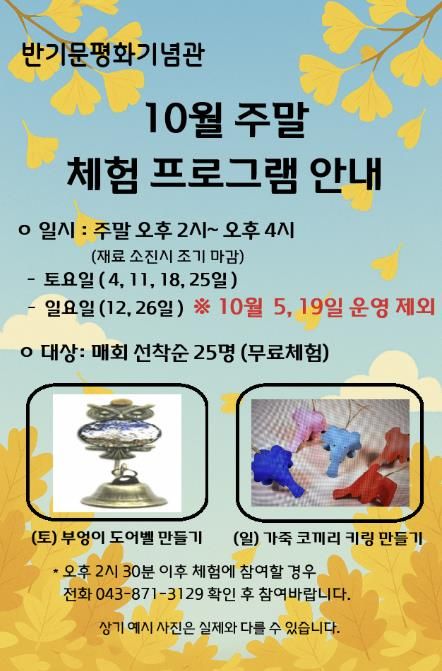 (포탈뉴스통신) 음성군 제8대 유엔사무총장 반기문 평화기념관에서는 관람객을 위해 10월 주말 무료 체험 프로그램을 운영한다.
